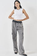 Calça reta em jeans black com modelagem moderna e caimento alongado. Possui elástico na cintura para ajuste confortável e bolsos funcionais na altura do joelho, adicionando um toque utilitário ao design. Versátil e estilosa, essa peça é perfeita para composições urbanas e contemporâneas, garantindo praticidade e um visual despojado sem abrir mão do conforto.