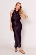 Saia longa em cetim acetinado, com modelagem reta e caimento fluido que valoriza a silhueta. Possui acabamento com leve brilho, que adiciona sofisticação e movimento ao look. Versátil e elegante, pode ser combinada com blusas delicadas ou tops modernos para composições que vão do casual chique ao sofisticado.