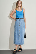 A saia midi em jeans com cintura alta tem estilo e praticidade. O comprimento clássico valoriza sua silhueta e combina com diversas graças. A modelagem reta garante conforto no dia a dia. Possui bolsos arredondados e cós tipo jeans com botão. Um toque moderno que transforma qualquer look.
