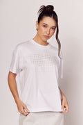 Camiseta em meia malha com aplicação de strass, trazendo brilho sutil e um toque sofisticado ao básico. Possui modelagem reta e caimento leve, garantindo conforto e estilo no dia a dia. Perfeita para compor produções modernas com jeans, alfaiataria ou saias.